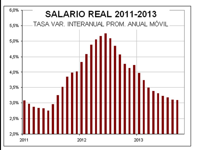 El salario real, aumentó 4,58% en 2005; 4,39% en 2006, 4,77% en 2007, 3,48% en 2008, 7,31% en 2009, 3,31% en 2010, 4,03% en 2011, y 4,23% en 2012. En lo que va del año, esa tasa ha ido en baja hasta llegar a 3,1%.