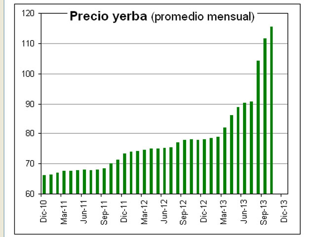 En la canasta de bienes y servicios que maneja el INE para el relevamiento de precios al consumo, el kilo de yerba durante octubre, arrojó un promedio de 115.45 pesos uruguayos. A fin de año pasado, el precio de la yerba según el INE estaba en $ 78,13 (ver gráfica 1).