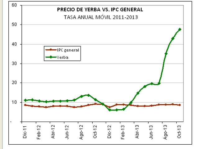 A fin de octubre, mientras que la tasa anual móvil del Índice de Precios al Consumo general es de 8,67%, la del precio de la yerba asciende a 47,63% (ver gráfica 2).