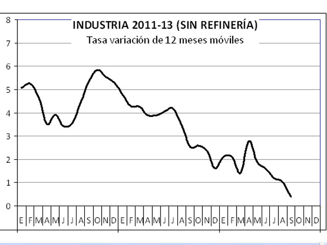 Al computar el índice sin refinería, las tasas de crecimiento anual móvil muestran que el ritmo de 4% y 5% ya quedó atrás, y que del 2% que mostraba a principios de este año, bajó al orden de 1% en el invierno y se ubica en 0,4% en setiembre.