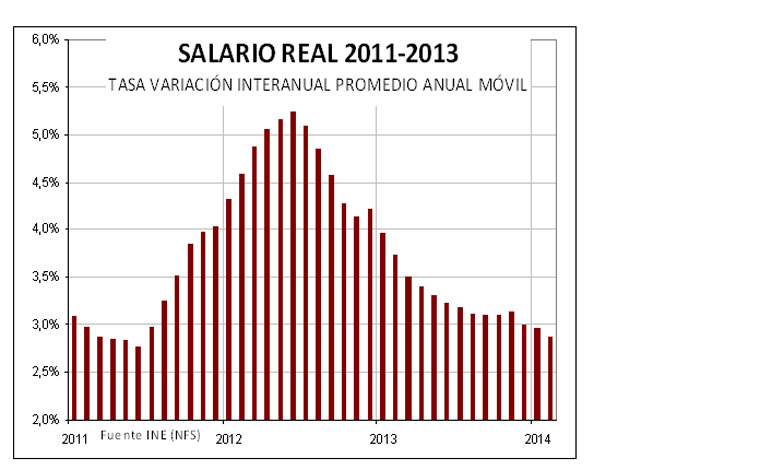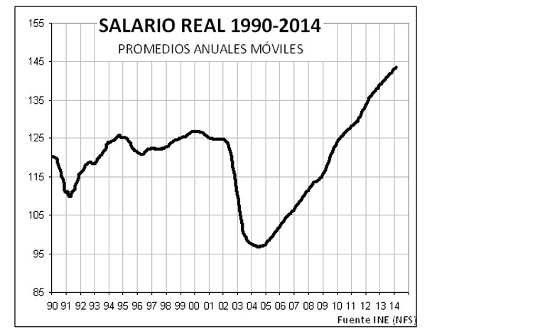 La comparación de la tasa de ritmo de aumento de poder de compra, en valores de promedios anuales móviles indica una tendencia a la desaceleración. El salario real, aumentó 4,6% en 2005; 4,4% en 2006, 4,8% en 2007, 3,5% en 2008, 7,3% en 2009, 3,3% en 2010, 4% en 2011, 4,23% en 2012 y 3% en 2013.