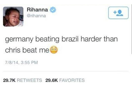 La cantante Rihanna hizo una polémica comparación en su cuenta de Twitter durante el partido de semifinales del Mundial entre Brasil y Alemania, cuando el equipo teutón goleó 7 a 1 a los cariocas en lo que es la goleada histórica más grande que recibió la "Canarinha" en la historia de los Mundiales.