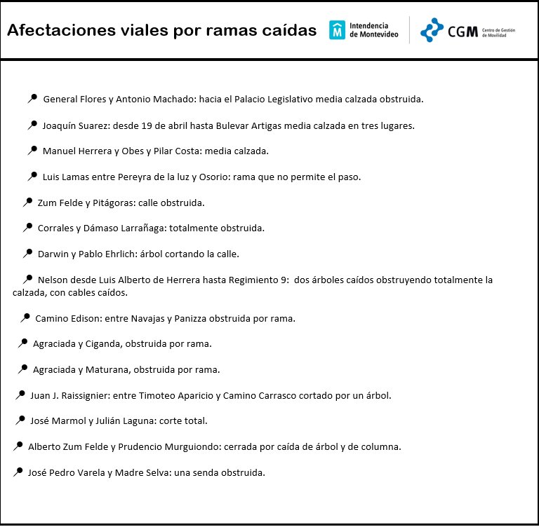 Además, desde la división Tránsito de la Intendencia de Montevideo, se informó esta mañana de cortes en varias calles de la capital por ramas caídas.