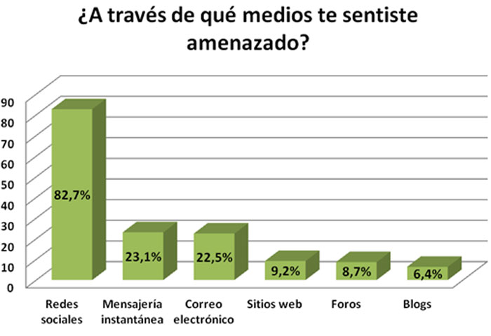 Respecto a los medios en los que se dio la situación de maltrato, predominaron las redes sociales como Facebook, Twitter y Google+, con el 82,7% de los votos.